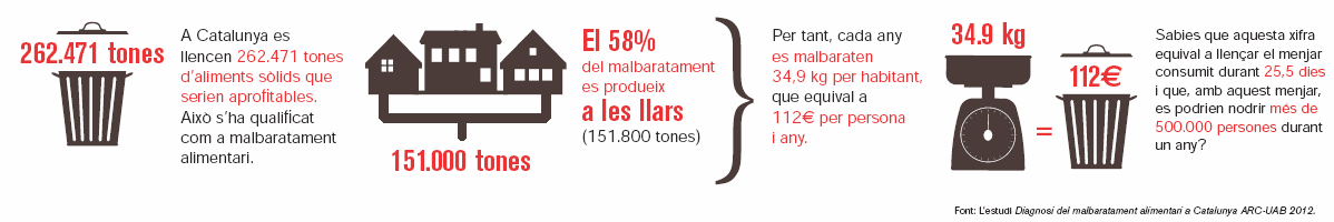 A Catalunya es malbaraten més de 260.000 tones d'aliments a l'any, mentre que el 22% de la població catalana viu sota el llindar de la pobresa. Amb el menjar que es llença durant un any es podrien alimentar 500.000 persones. En diferents estudis s'ha comprovat que més de la meitat dels aliments que es llencen es fa a les llars (81 kg a l'any en una família de dos adults i dos infants). Per això, és tan important que vosaltres, pares i mares, amb el vostre exemple, feu conscients als fills que amb petits canvis de comportament i actitud tothom pot fer un consum més responsable que eviti el malbaratament i que ajudi a millorar les condicions socials i ambientals de l'entorn.